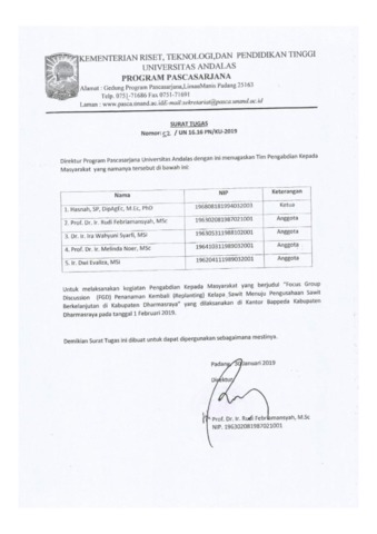 Surat Tugas Pengabdian "Focus Group Discussion (FGD) Penanaman Kembali (Replanting) Kelapa Sawit Menuju Pengusahaan Sawit Berkelanjutan di Kabupaten Dharmasraya" 2019