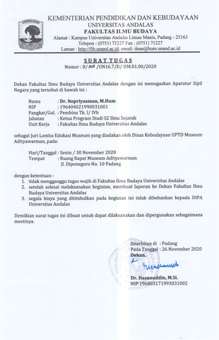 Nopriyasman, Nopriyasman ST Dekan No. B/808/UN.16.7/HM.01.00/2020 sebagai Juri Lomba Edukasi Museum Adityawarman. [Image]